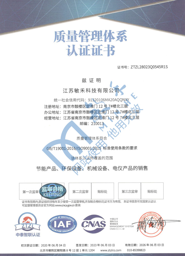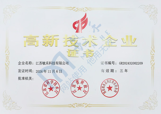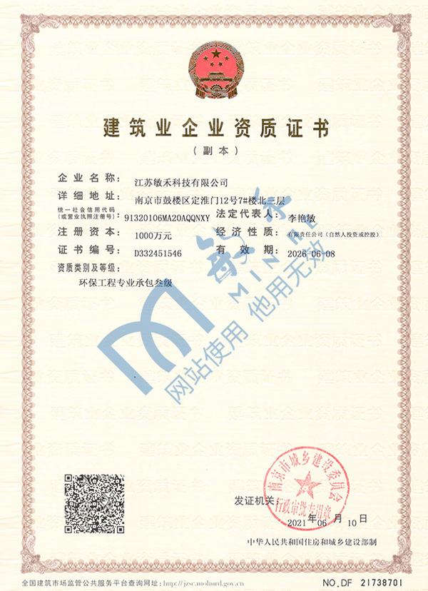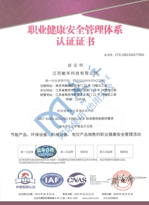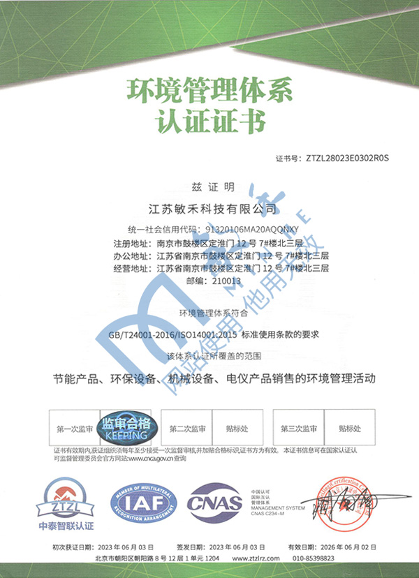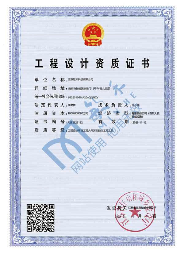江蘇敏禾科技有限公司已通過ISO9001/ISO14001/ISO45001三體系認證、中國環境保護產業協會會員單位、擁有工程設計環境工程大氣污染防治工程乙級、環保工程專業承包叁級資質和安全生產許可證,取得高新技術企業證書,等等...