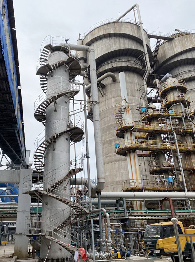 本項目對脫硫后的焦爐煤氣進行脫氨凈化,其成分為CO、H2、氨氣、含酸廢氣、脫硫液尾氣、硫泡沫等。我公司為本項目配套供應一臺酸洗塔,處理尾氣中的氨。酸洗塔尺寸DN2200×H19600mm,酸洗塔內設置兩層填料和一層再分布器,處理煙氣量13000Nm3/h,循環液采用3%稀硫酸。尾氣中氨氣濃度最大10g/Nm3,平均5g/Nm3,出口尾氣中氨氣濃度降低至10mg/Nm3以下,于2023年8月完成安裝交付投用。