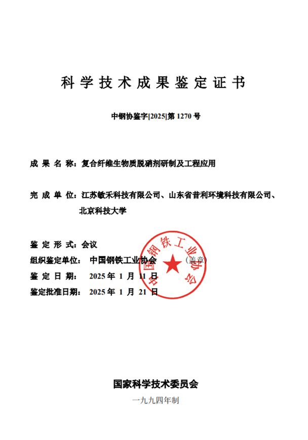 2025年1月11日, 由中國鋼鐵工業協會組織的科技成果評價會在北京圓滿召開。江蘇敏禾科技有限公司、山東省昔利環境科技有限公司、北京科技大學等單位共同完成的“復合纖維生物質脫硝劑研制及工程應用”項目,順利通過中鋼協科技成果評價。專家組一致認為,該成果整體技術達到國際先進水平!